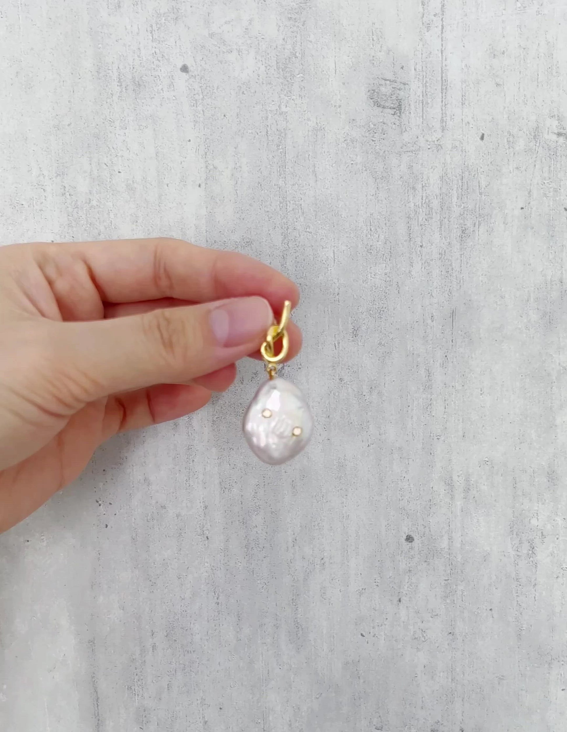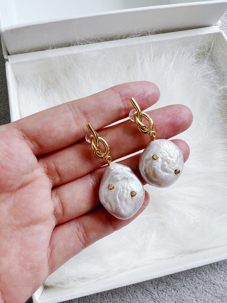 Baroque pearls are all the rage. The unconventional and irregularity are what makes baroque pearls highly sought after. This pair of earrings are made from freshwater pearls with cubic zirconia crystals, and 925 silver finished with a gold-tone. Earrings are made for pierced ears and imported from South Korea. As this pair of earrings is handmade, it has a very limited run and will not be restocked. Do note that the baroque pearls are naturally 'flawed' and no two pearls are identical.