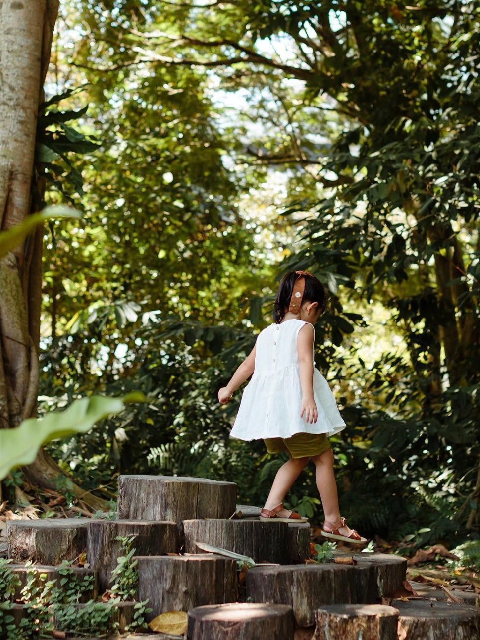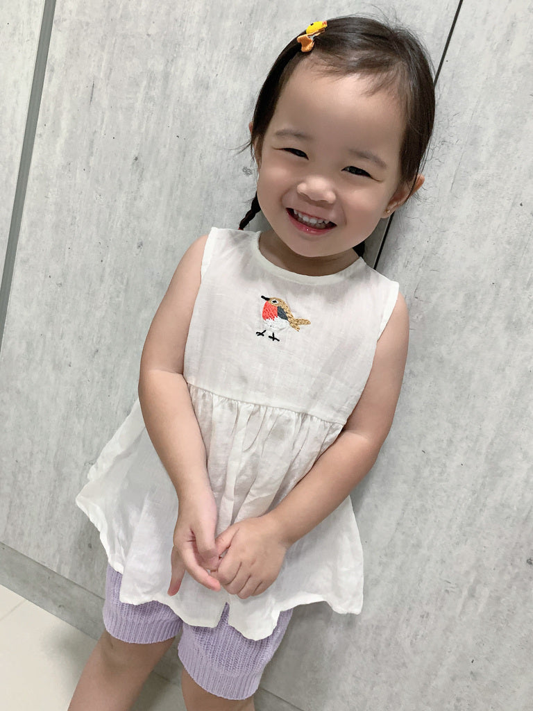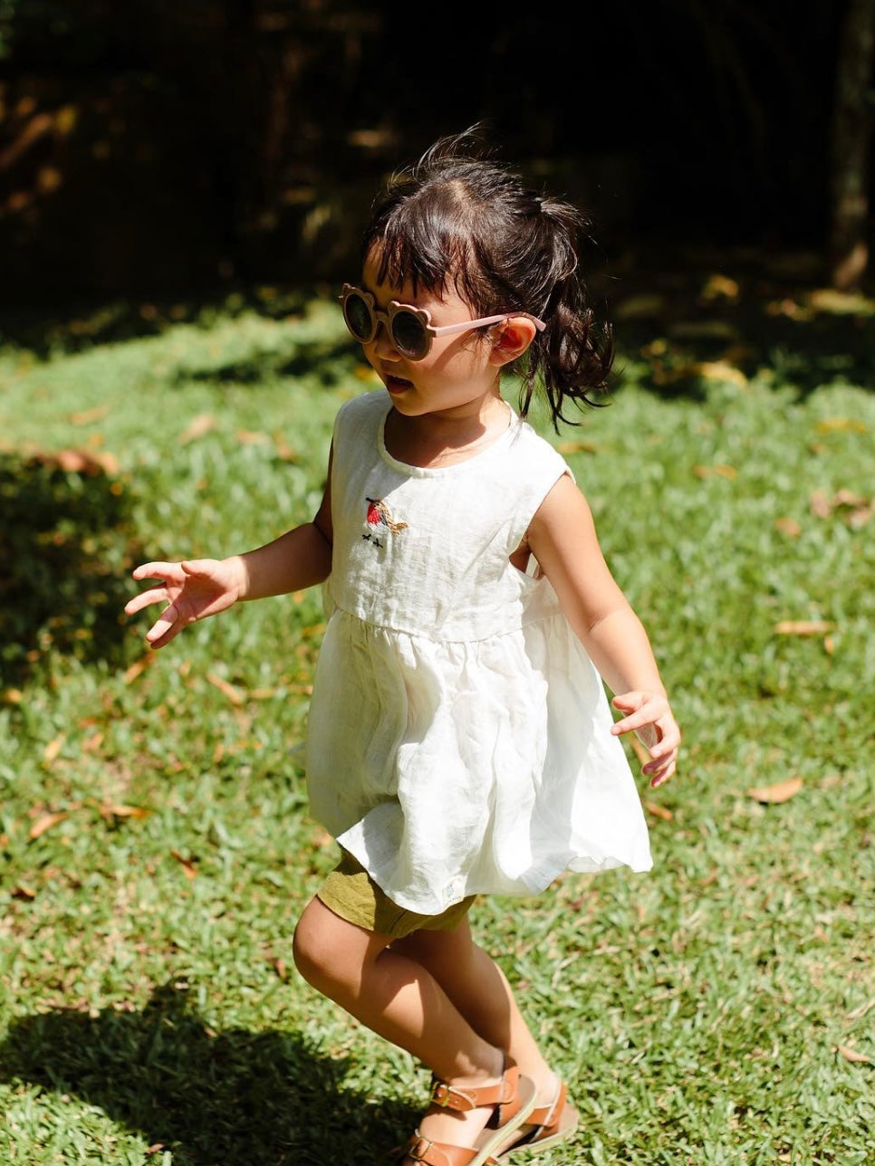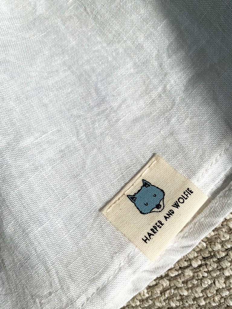 Harper has a penchant for birds so it was easy to decide the design of our first embroidery - a robin. Made with 100% linen, Birdie fastens with back buttons. It took us months to master the embroidered details and ensure the embroidery area wasn't scratchy on the skin. In a versatile snow colour, Birdie is wonderful for the hot summer weather. Bid goodbye to scratchy necks, our Harper and Wolfie clothing label is neatly sewn on the hem of Birdie.
