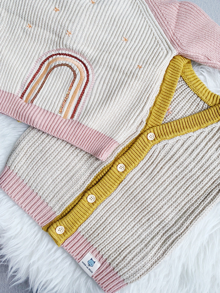The rainbow and stars knitted on the back of Capri are what stole our hearts. Adorned with a row of delicate sequins on the back, Capri is our favourite cardigan of the season. Bid goodbye to scratchy necks, our clothing label is neatly sewn on the hem.