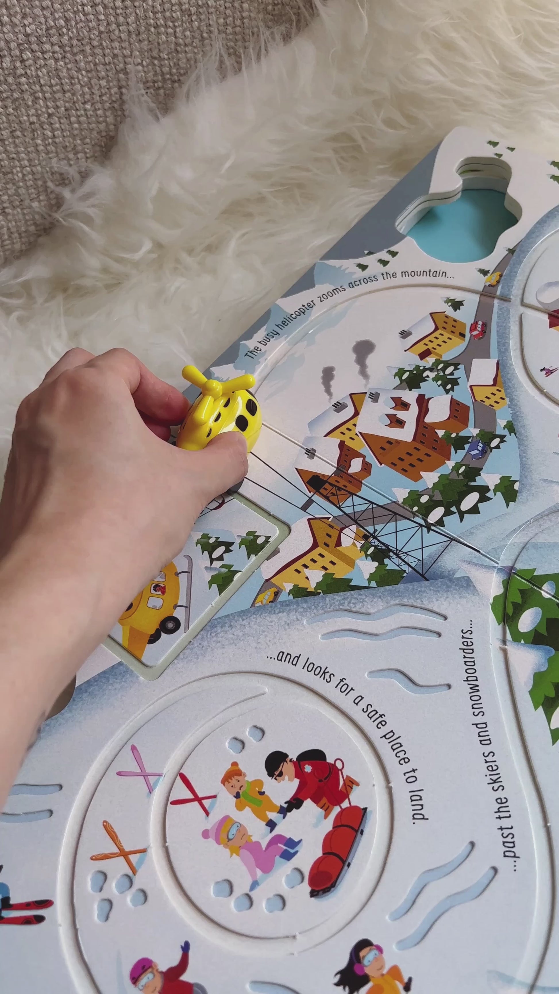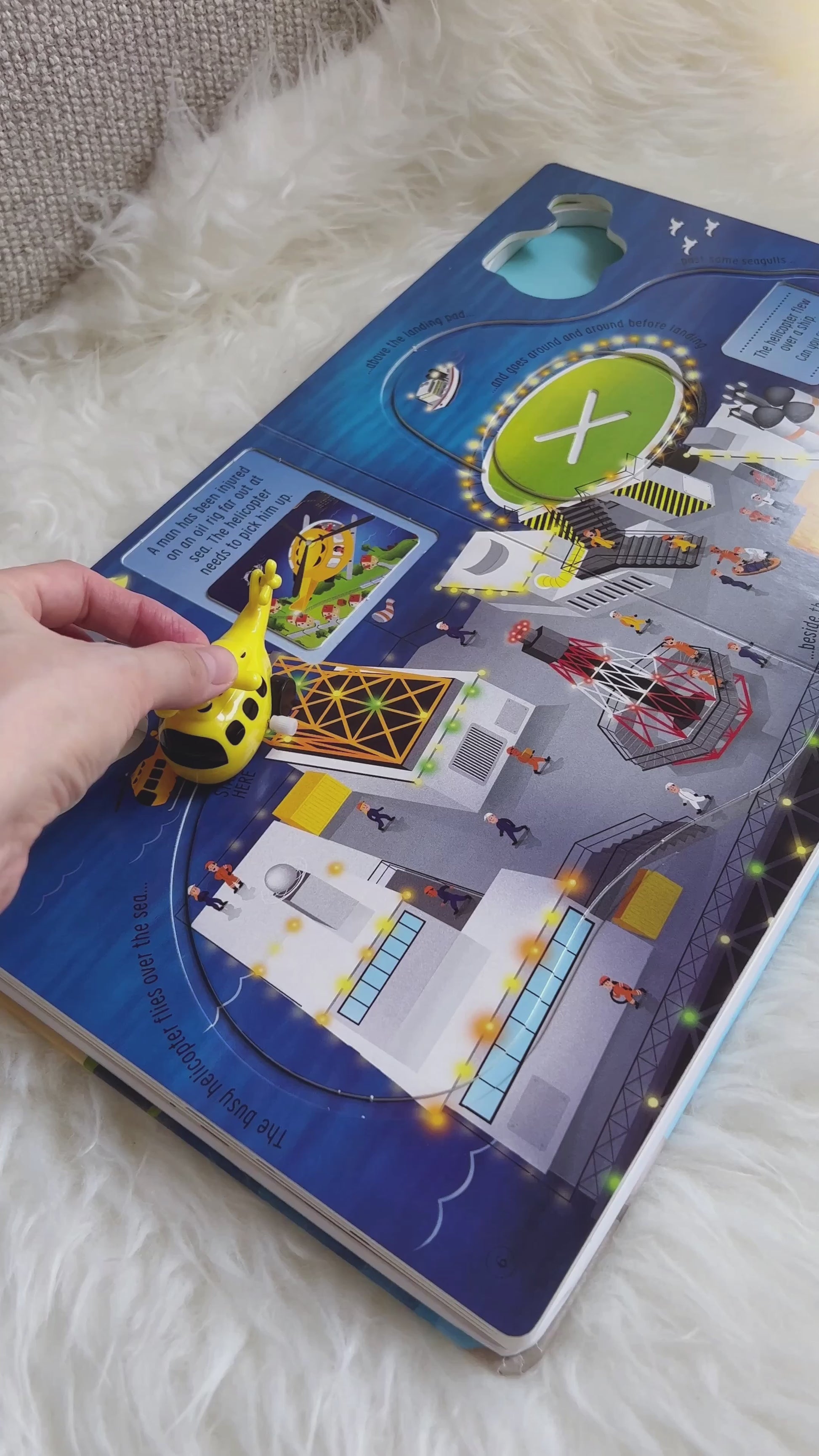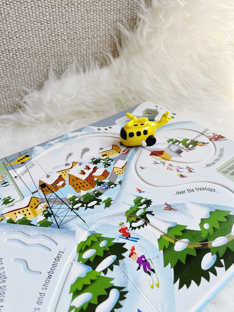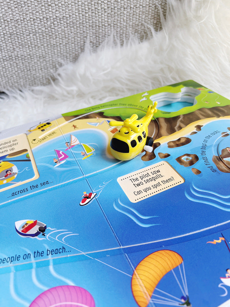 Children will enjoy winding up the helicopter and watching it zoom around the tracks time and time again in this exciting interactive book. The colourful scenes with tracks embedded in the pages show the helicopter helping boys stranded on rocks at the beach, rescuing an injured skier on the mountain and arriving at an oil rig.